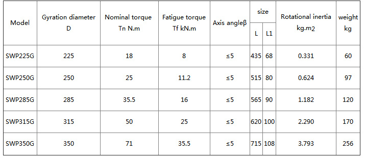 SWP-G universal joint coupling Features and applications: Bearings are wearing parts. In order to facilitate the replacement of the bearing, the bearing seat gland is made into a split type, bolted, and can work under the condition of β≤5°~10°. Applicable to rolling machinery, lifting and transportation machinery, engineering machinery, mining machinery, petroleum machinery and other heavy machinery, connecting two different axes of shaft drive, can not buffer, reduce vibration.