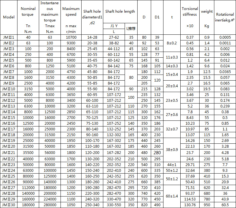 Characteristics and application of JMII diaphragm coupling: Compared with flexible coupling of metal elastic component, it has high mechanical strength, large bearing capacity, light weight, small size, high transmission efficiency and high transmission accuracy, and good reliability. Easy to assemble and disassemble. Suitable for medium, high speed and large torque shaft drive. Compared with the drum-shaped gear coupling, it has no relative sliding, no lubrication, long service life, no noise, simple structure and so on. It can partially replace the drum-shaped toothed auxiliary device. Not affected by temperature and oil. It has the characteristics of acid resistance, alkali resistance and corrosion resistance. It can be used in high temperature, low temperature and working conditions with oil, water and corrosive media. It is suitable for shafting transmission with little change in load of various mechanical devices. It is extremely versatile and has been widely used in industrialized countries. It is a high-performance flexible coupling 重點 which is mainly promoted and applied in China. High-precision diaphragm coupling can be used for High speed conditions. Compared with the toothed coupling, the diaphragm coupling has no relative sliding, no lubrication, no sealing, no noise, no maintenance, and is convenient to manufacture. It can partially replace the gear coupling. The diaphragm coupling has been widely used in industrialized countries in the world. In practical applications, the intermediate shaft type is generally adopted to improve the offset compensation performance of the two axes. JMI type - basic type with countersink; JMIJ type--with countersunk and intermediate shaft type; JMII type - no counterbore basic type; JMIIJ type - no countersinking intermediate shaft type; ![]() ![]() |