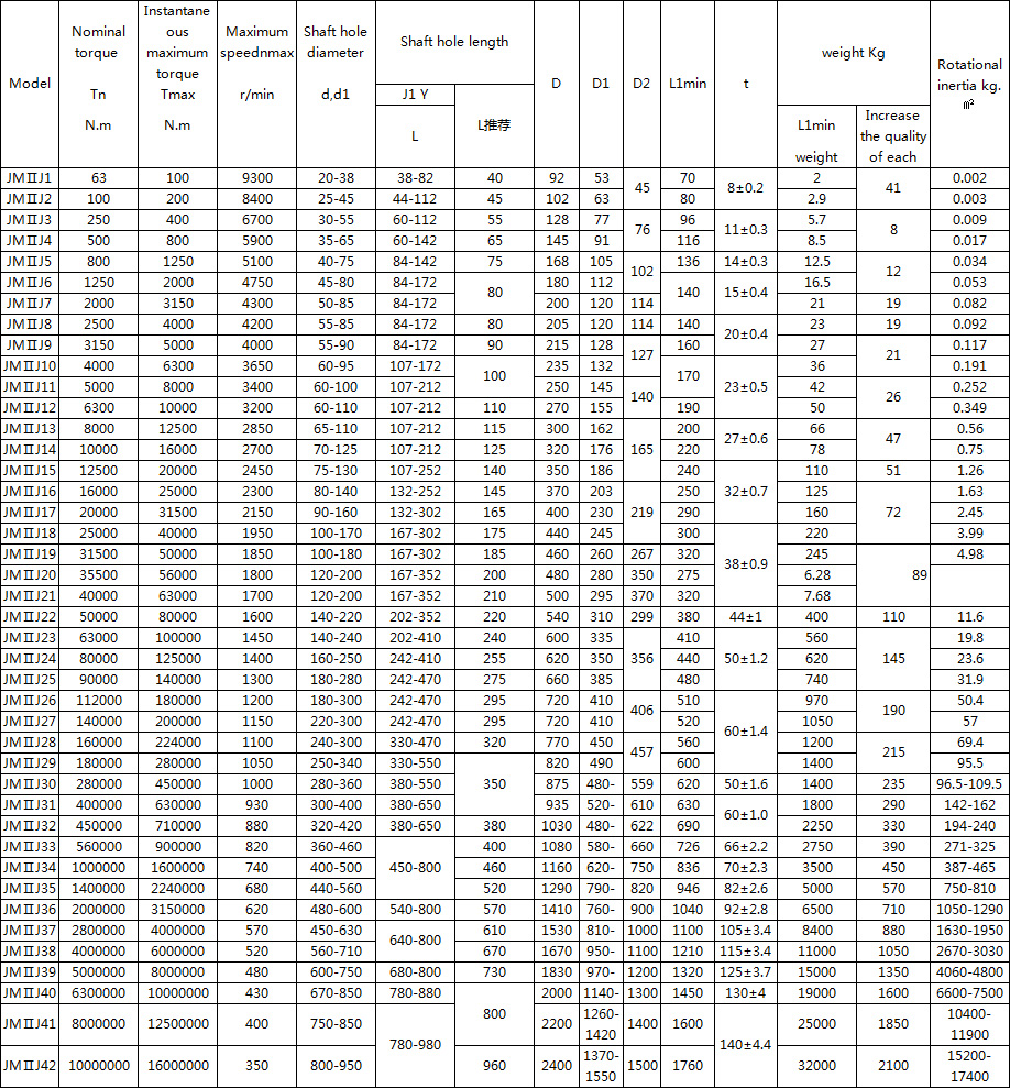 Features and application of JMIIJ diaphragm coupling: Compared with flexible joints of metal elastic components, it has high mechanical strength, large bearing capacity, light weight, small size, high transmission efficiency and high transmission accuracy, and good reliability. Easy to remove and so on. Suitable for medium, high speed and large torque shaft drive. Compared with the drum-shaped gear coupling, it has no relative sliding, no lubrication, long service life, no noise, simple structure and so on. It can partially replace the drum-shaped toothed auxiliary device. Not affected by temperature and oil. It has the characteristics of acid resistance, alkali resistance and corrosion resistance. It can be used in high temperature, low temperature and working conditions with oil, water and corrosive media. It is suitable for shafting transmission with little change in load of various mechanical devices. It is extremely versatile and has been widely used in industrialized countries. It is a high-performance flexible coupling 重點 which is mainly promoted and applied in China. High-precision diaphragm coupling can be used for High speed conditions. Compared with the toothed coupling, the diaphragm coupling has no relative sliding, no lubrication, no sealing, no noise, no maintenance, and is convenient to manufacture. It can partially replace the gear coupling. The diaphragm coupling has been widely used in industrialized countries in the world. In practical applications, the intermediate shaft type is generally adopted to improve the offset compensation performance of the two axes. JMI type - basic type with countersink; JMIJ type--with countersunk and intermediate shaft type; JMII type - no counterbore basic type; JMIIJ type - no countersinking intermediate shaft type; ![]() ![]() |