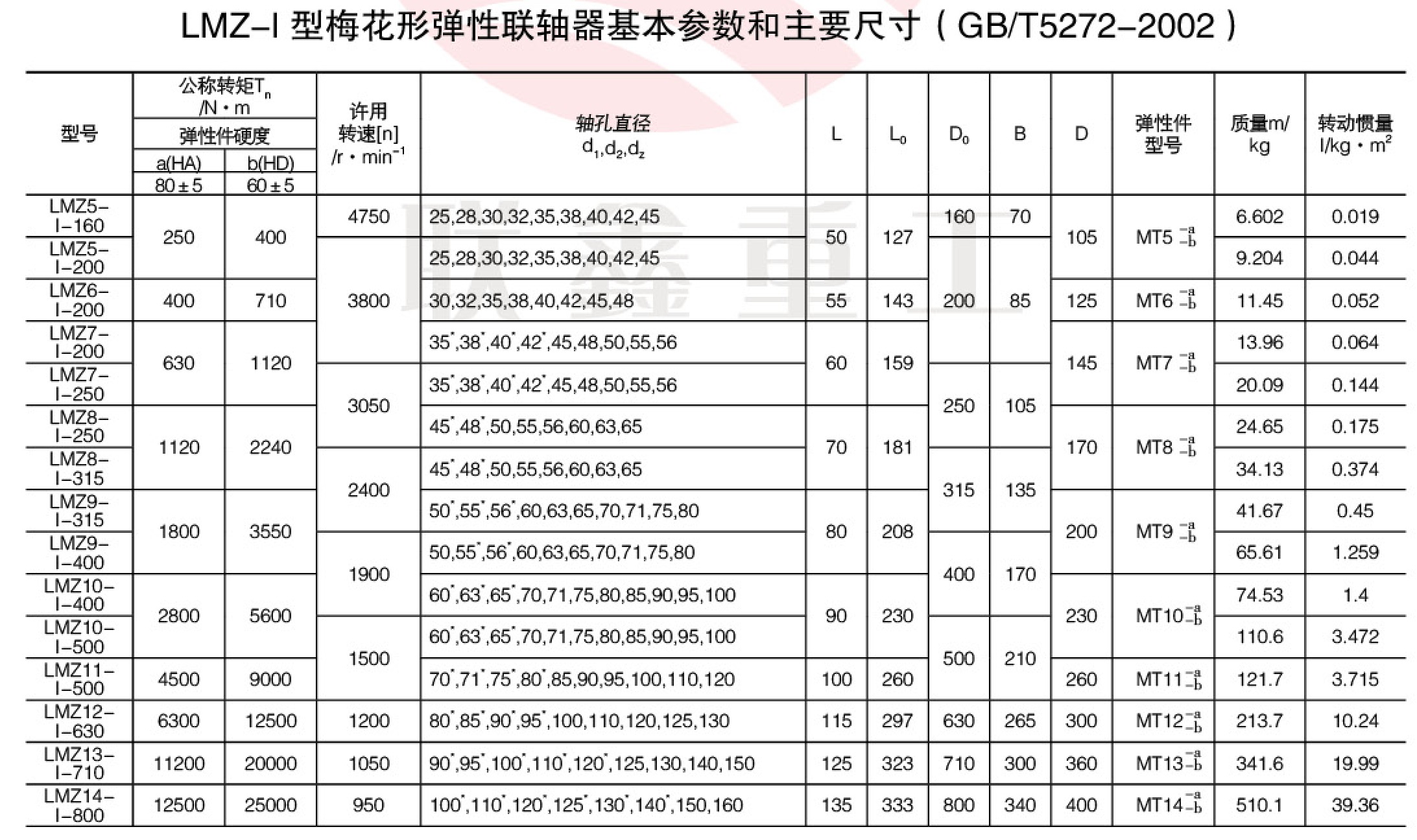 MLL-I(LMZ-I)梅花聯(lián)軸器 特點及應(yīng)用場合:具有補償兩軸相對偏移、減振、緩沖性能、徑向尺寸小,結(jié)構(gòu)簡單、不用潤滑、承載能力較高,維護方使、更換彈性元件需軸向移動 (MLS型除外),適用于聯(lián)接同軸線,起動頻繁,正反轉(zhuǎn)變化,中速、中等轉(zhuǎn)矩傳動軸系和要求工作可靠性高的工作部位。不適用于重載、低速及軸向尺寸受艱制,更換彈性元件后兩軸對中困難的部位。